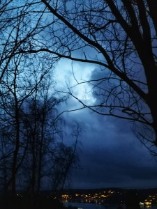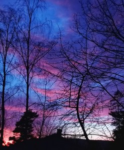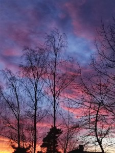 Jeg begynner å tenke som en mobilfotograf, og har alltid kameraet klart. Når en fargeprakt som den nedenfor vises på himmelen, er det bare å løpe ut og fange synet. Disse tre bildene er tatt rett etter hverandre 1. januar. Litt forskjellig vinkel, og fargene ble helt annerledes. Ikke lenge etterpå var det mørkt.
