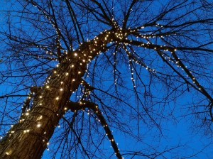 Jeg elsker de gule lysene mot den vinterhvite bakgrunnen på bildet til høyre. Bildet av kråka i toppen av treet er tatt med høy digital zoom, noe som betyr færre piksler. Resultatet her er en litt tegneaktig effekt.