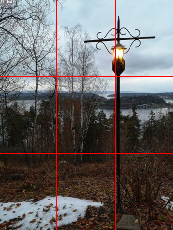 Tredelsregelen, som er en forenklet versjon av det gylne snitt, er en teknikk for å skape et balansert bilde der hovedmotivet er “visuelt riktig” plassert: Slå på rutenettet i kameraet, så blir bildet delt i 3×3 like ruter. Plasser viktige motiver i eller nær et av skjæringspunktene i stedet for midt på bildet (hvis du ikke vil ha et helt symmetrisk bilde, da).