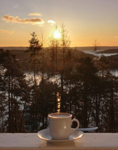 Soloppgangen var også lekker de første dagene i det nye året. Jeg liker måten solen reflekteres på fra det hvite porselenet. På bildet til venstre er kaffekoppen tom. Dagen etter prøvde jeg å rekonstruere motivet med en fylt kaffekopp, men himmelen var ikke så fargesprakende. Derimot ser det ut som om gylne solstråler drypper ned i kaffen – det er et lite dikt der. 🙂