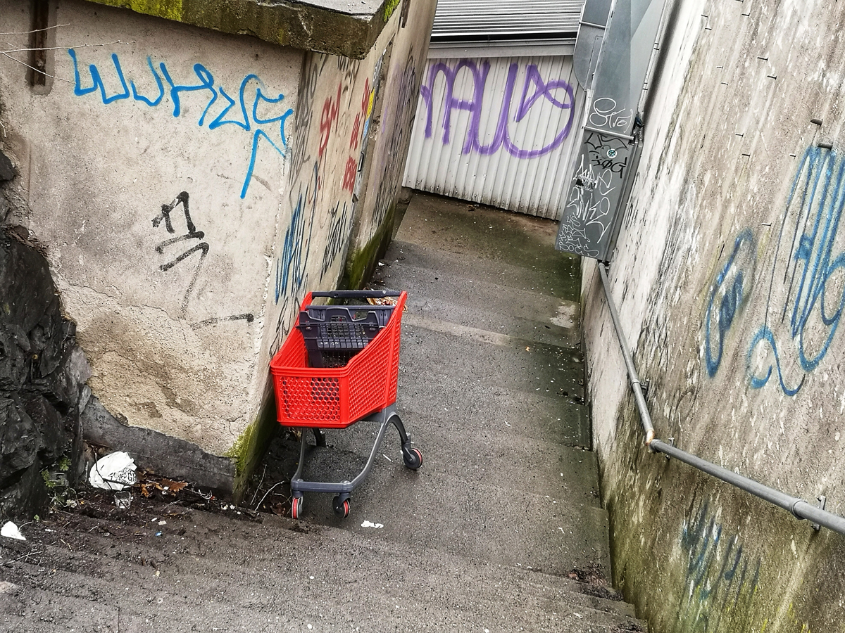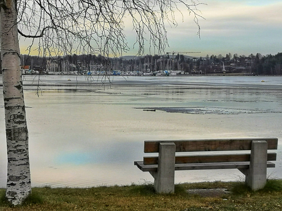 Jeg går forbi denne benken nesten hver dag. Noen ganger sitter det folk der, eller benken står der helt alene. Jeg ville prøve å fange “forlatt benk”-stemningen. Det var en overskyet dag, og jeg fotograferte benken fra alle vinkler og kanter, men resultatet var bare en benk som sto der. Helt flatt. Til slutt fikk jeg to brukbare bilder, synes jeg selv:
