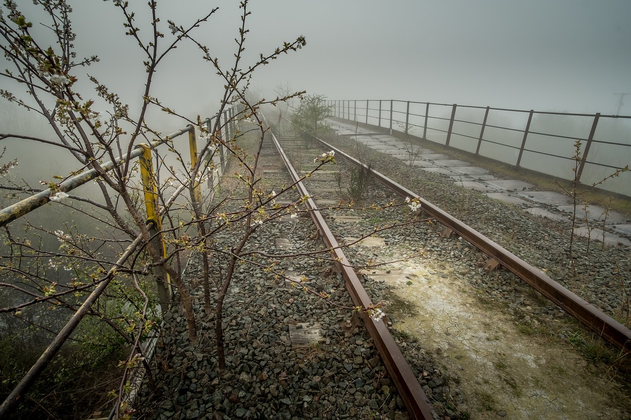 Ledende linjer kan være naturlige linjer som veier, stier, brostein, togskinner, gjerder eller husrekker som skaper dybde og trekker seeren inn i bildet i retning av et objekt der fremme. Eller et forlatt jernbanespor kan bare fortsette inn i tåkehavet (bilde: Tim Hill på Pixabay):