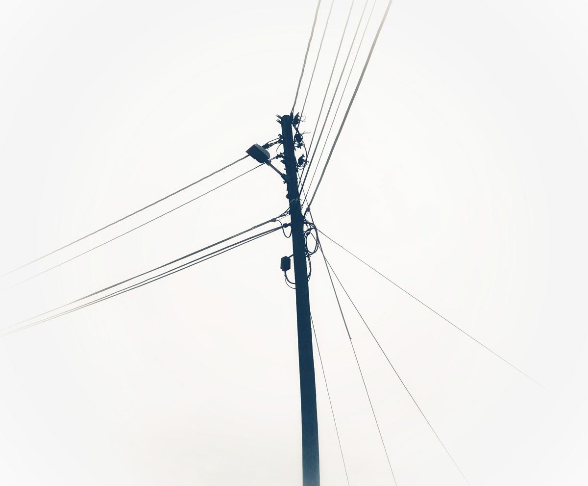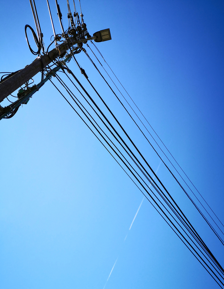 Kraftledninger danner flotte linjer. Da jeg tok bildet til venstre, dukket det opp en ekstra linje på himmelen, i form av en fartsstripe etter et fly.