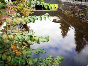Jeg vil komme raskt i gang, så jeg tar en runde i nabolaget og knipser noen bilder med automatiske innstillinger: en trapp som går opp og opp og ser ut til å fortsette utenfor bildet, en høstlig murkant, trær som speiler seg i vannet og strekker seg mot himmelen langt der nede, og en enslig graffitifyr i et trappehjørne. Tenker at trappebildet kanskje ville vært mer spennende hvis det var en person på vei opp trappen. Kanskje jeg kunne brukt kameraet med stativ og selvutløser og plassert meg selv i bildet? Resultat etter beskjæring: